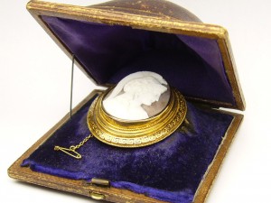 Items like this really define the term “estate jewellery”. This hand made hand carved cameo dates from the late 1800s and is of the finest quality I have seen. It sits in it’s original velvet box. The jewellers name is still just visible on the inside lid and reads MURRAY GLASGOW. This is a rather large piece at 48mm x 41mm. It can be worn as a brooch or a pendant, the small safety chain can be removed when worn on a necklace. The shell cameo has amazing detail not often seen in today’s cameos. The artist has signed the back of the cameo, the name appears to be Johnny Scori. The subject depicted on the cameo is perfectly suited to the design of the frame with the interlocking Greek key pattern and several layers of rope edging. The piece weighs 15 grams in total and is most certainly a one of a kind item. Estate priced at $1,400.00 CAD. Stock #e5940.