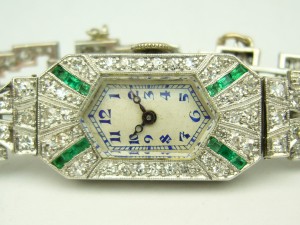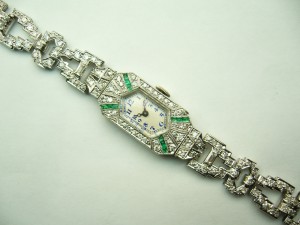 Don’t think of this as a watch but a piece of jewellery that also tells time. This is much more like an antique diamond and emerald bracelet than a watch. The beautiful hand engraved case contains top quality natural emeralds and diamonds along with an attached diamond set bracelet. There are 212 diamonds set in this piece weighing over 2.00 carats of VS-SI-FG quality. There is over 25 grams of platinum alone in this watch. The timepiece is a high quality Swiss made Robert Cart movement marked 11332, serviced recently and running well. The watch and bracelet measure 7.25 inches long and should fit most ladies wrists. This watch comes with a one year warranty and estate priced at $5000.00.