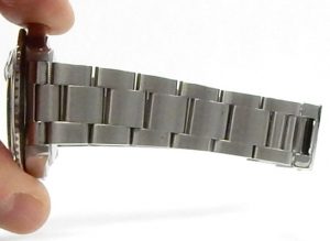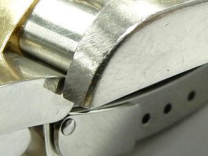 Solid end links and no lug holes in the features seen on only the latest versions of this watch. The vast majority have flimsy stamped bracelet end links with the old school lug holes in the case. The watch is worn but hasn’t been abused; its most significant blemish is this impact mark on the gold bezel