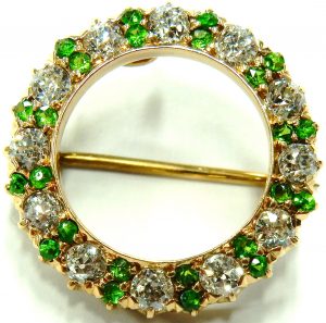 In the many decades Bill Le Boeuf Jewellers has bought and sold antique jewellery we have never had an example of this exotic variety of garnet. A green garnet is a fairly rare gem in it’s own right but when is shows dispersion (the break up of white light into the spectral colours) it becomes something exceptional. These little green gems sparkle just like a diamond with an estimated total weight of 0.50 carats. It is something that needs to be seen in person in some good light. The 12 early European cut diamonds measure over 3.0mm diameter each and weigh to a total of 1.35 carats of good SI-FG quality. The simple circular design measures 23mm diameter and weighs 4.7 grams. Secured by a pin hinge with safety lock the piece can also be worn as a pendant by means of a hidden bail. The one of a kind brooch/pendant is estate priced at $2100.00. Stock #e7525.