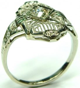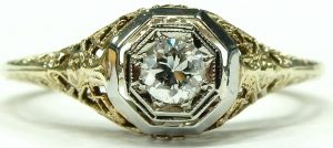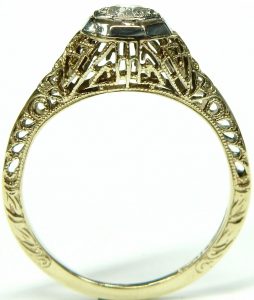 Art Deco style can been seen in everything from jewellery, cars, architecture, furniture, clothing and even household appliances of the era were given the Art Deco treatment. Our latest estate piece is a time capsule from the 1920s. It’s been remarkably preserved in its original condition. No evidence of any repair work or sizing adjustments could be found. The delicate saw pierced filigree gallery is perfect. The tiny milgrain details look flawless despite being around 90 years old.