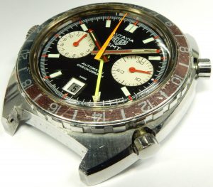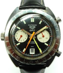 Some of Heuer’s early models were named after some of the world’s most famous race tracks and races. Vintage Carrera and Monaco watches have seen amazing increases in value lately with prices well into 5 figures. When the Autavia 1163 GMT was introduced in 1970 it was about the most complicated production sports watch around. Not only was it one of the first automatic winding chronographs it also incorporated a date feature plus a 2nd hour hand with a rotating bezel to indicate a 2nd time zone. This was the watch to have for the professional racer or bench racer fan. Selling for around $275.00 USD this was a watch for the serious aficionado, especially considering the standard Heuer Carreras were selling for only around $100.00. The name Autavia is a blend of the words automotive and aviation. The chronograph feature is very useful in both pursuits while the 2nd time (Greenwich Mean Time) function is useful for the pilot or world traveler.