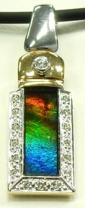 We seldom get these spectacular Canadian gems and it’s always fun to show them off when we do. Ammolite is a rare opal like gem found along the eastern side of the Rocky Mountains mostly in Alberta Canada. They formed from the fossilized shells of the long extinct Ammonite. They were a swimming shellfish similar to the modern day Nautilus. Some of these tentacle equipped creatures reached sizes of over 4 feet diameter. Although they went extinct with the dinosaurs millions of years ago they left behind some of the most colourful gems around. Available in almost every colour of the spectrum they are most often seen in an iridescent dark green colour with orange, red and yellow highlights. Quite often they show a crocodile type pattern and our example is no different. The 14.5mm x 5.5mm tablet cut is bezel set in a simple rectangular frame. The yellow and white gold frame setting has been bead and bezel set with 16 small diamonds totaling 0.10 carats of I1-I quality. The large hinged bail will fit almost any chain or even a small pearl necklace. We’ve hung the pendant from a simple rubber cord giving the piece an even more edgy modern look. Perfect like new condition not showing a single scuff or scratch on the stone. Ammolite are soft delicate gems best used in pendant applications. Only clean ammonite jewelry with a soft, dampened cloth to gently wipe the surface. Avoid ultrasonic cleaning, detergents or chemicals. Necklace and pendant are estate priced at $560.00 CAD. Stock #e11176.