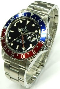 Rolex is an immense company with a powerful influence on the watch and jewellery industry. Much like a glacier that slowly changes the environment to conform to it, Rolex does what it likes whether or not it makes sense to anyone else. The power of the Rolex brand has defined how the world experiences time keeping in wristwatch form. Love them or love to hate them you have to admire them. In this world of atomic clocks and electronic timing with accuracy levels measured in millionths of a second, why would anyone be interested in a mechanical wrist watch only guaranteed accurate to about plus or minus a few seconds a day. Why; because it’s a Rolex. The GMT-Master is one of their most iconic models that was designed over 60 years ago but still looks and functions just as it did in 1954. Originally built as a professional tool for pilots travelling through multiple time zones. The GMT Master has an extra hour hand plus a rotating bezel indexed for 24 hours to display a second time zone. The popular “Pepsi” bezel goes a bit further showing the daylight hours in red and the night hours in blue.