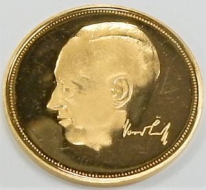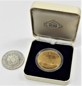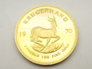 Before there were Canadian maple leaf gold coins this coin was one of the most desirable. The South African Krugerrand contains 1 troy ounce of fine gold and trace amounts of copper and other metals. It is 22 karat gold and 91.7% pure. These coins have no monetary denomination and trade mostly with the price of gold. When this coin was new gold was trading under $50.00 per ounce. If only I knew what it would be selling for next year. The estate price for this coin is spot market value only. We do not add any premium. It is being sold for it’s gold value only.