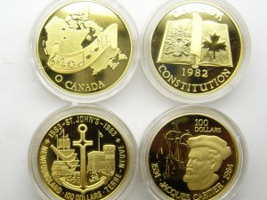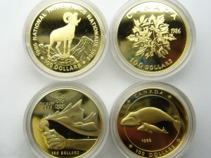 Collection of four $100 Canadian gold coins. Two coin are 22 karat and contain 1/2 ounce of pure gold and two are 14 karat and contain 1/4 ounce of pure gold. They date from 1985, 1986, 1987, 1988. Each come with the original plastic protective case. They are all in perfect condition and being sold for spot price only. No premium added. Each sold separately. Stock #e6377.