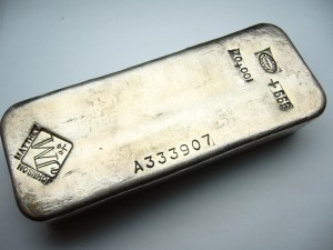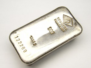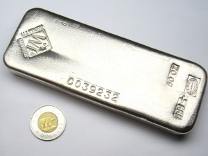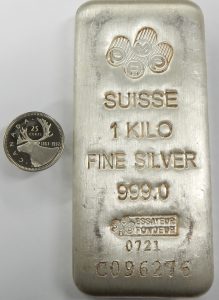 One 999 silver ingot 1000 grams. This bar weighs over 32 ounces. It is from Degussa refinery in Germany. Since this is a 99.9% pure silver bar there is no HST on it’s purchase. It is estate priced at spot plus 15%.