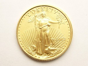 U.S. $5.00 gold coin containing 1/10 ounce of fine gold. This one dates from 2003 and is in great condition. Estate priced at spot market plus 10%. These coins are not rare but are just plain cool, they are a little smaller than a Canadian dime but are twice as heavy due to their gold content.