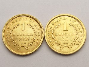 We are not coin experts at Bill Le Boeuf Jewellers but sometimes we come across interesting examples. These two $1.00 U.S. gold coins date from 1853 and 1854. They came in as a set of earrings which is why they are in such good condition. They had a tiny jump ring soldered to the edge that has been removed. As a piece of jewellery they didn’t suffer the wear and tear associated with a coin that has been in circulation for many years. Made from 90% pure gold they weigh a combined 3.33 grams. When new the published weight was 1.672 grams each, so they have retained over 99% of their original mass. I think they are a great value at $400.00 for both but I will let the numismatics out there decide. I will gladly email pictures to anyone interested.