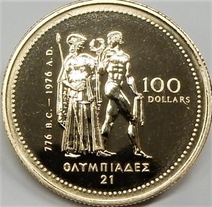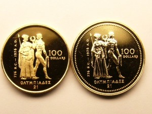 The 2 coins are Canada’s first $100.00 coins ever minted making them just a little more unique. Made to celebrate the first Olympic games ever held in Canada. The smaller coin is made from 22 karat gold and contains exactly 1/2 ounce of pure gold. The larger coin is made from 14 karat gold and contains 1/4 ounce of pure gold. They are each priced at 5% less than the value of gold each contains! We have a limited number available, call before you come in. These make great gifts and are in great condition.