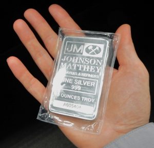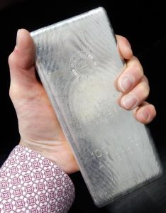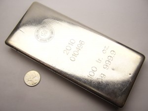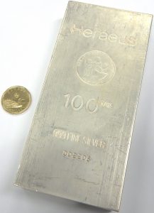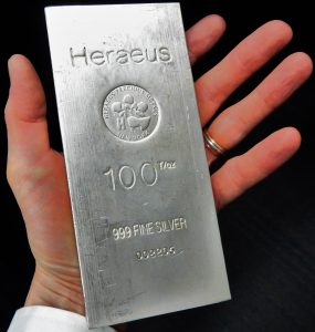Silver bullion is so inexpensive right now. 1 ounce of silver is over 85 times less expensive than 1 ounce of gold. The historic relationship of gold vs. silver price is closer to 40 to 1 and gold is only around 17 times more rare than silver. There have only been 2 other times in history that I’m aware of when the silver/gold ratio has been higher than right now. This tells us that gold is overpriced or that silver is under priced. With all the chaos in the world at the moment my personal belief is both silver and gold are under valued but much more so in the case of silver. With silver pricing as low as it has been for the last few years we’ve slowly been acquiring silver but seldom (almost never) do we sell any of it. For all those people who call us asking for silver bullion here’s your chance. This 100 ounce bar of 999 fine silver was made by Heraeus Precious Metals New York. The bar only measures around 6 1/2″ x 3″ x 1″ but is surprisingly hefty when you hold it in you hand.