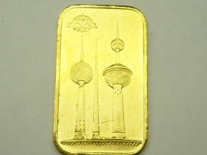For all the gold bugs around here is an opportunity to get a very unusual gold wafer. The 10 gram 999.9 pure bar depicts the towers in Kuwait city. This bar is HST exempt and is estate priced at spot gold price plus 5%. I have never seen a wafer like this before.