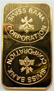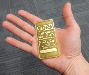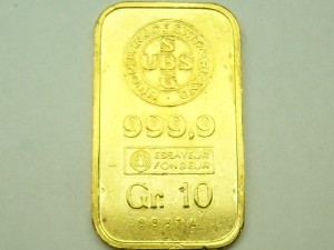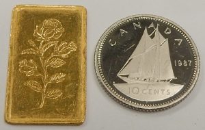 Here’s something to think about. Paper currency has no intrinsic value, it is only a promissory note guaranteed by the government that issued it. If that currency happens to be issued by the Canadian government, for instance, you’re holding a tiny part of the estimated 1.2 trillion dollars of debt Canada has (your portion is around $30,000.00). The spot price of gold changes every minute. For an up to the second spot price, click on www.kitco.com. We have one and only one 10-ounce gold bar in stock. For credit card purchases please add 2%. This 10 ounce bar (311 grams) is estate priced at the current spot price plus 3%. Stock #912-00471.