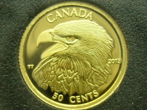 A Canadian gold coin with an iconic symbol of the USA this coin is an oddity indeed. The strange denomination of only 50 cents is a bit unusual too. This is a small coin measuring only 13.92mm diameter but big on quality being 99.99% pure and therefor not subject to the HST. Limited in quantity to 10000 and mostly sold out. The Canadian mint has a few of these 1/25 oz. pure gold coins left on sale for $129.95 plus shipping. This coin is complete with it’s original box, sleeve and certificate. Untouched in perfect condition sealed in the plastic container it was delivered in. Estate priced at $99.00 with no added tax or fees.