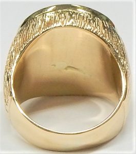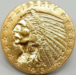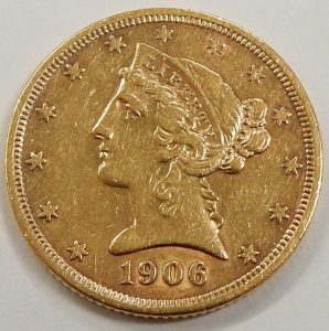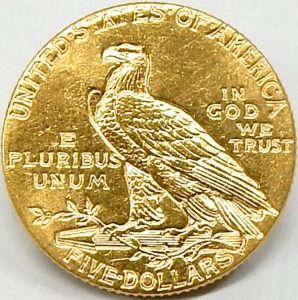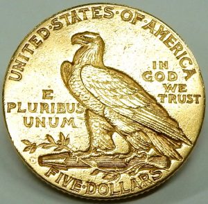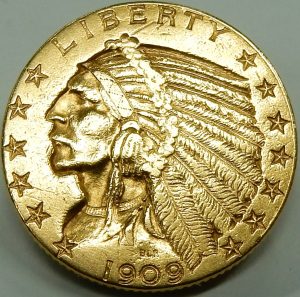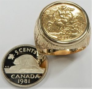 We get an amazing variety of interesting jewellery and precious objects at Bill Le Boeuf Jewellers. You never know what may turn up in the store or on our estate website pages. Although we’re not coin experts by any means we love the artistic and intrinsic value of all things beautiful including coins. When you look at this $5.00 U.S. coin from 1909 it’s hard not to be inspired by the emotionally stirring images each side portrays. Never mind the antique significance, rarity and actual gold value of the coin; the artistic value alone is reason enough to purchase something like this. This coin weighs 8.350 grams and is of 90% purity. In over 100 years, only 0.009 grams of weight has been lost due to wear and tear. The small scratches and scuffs that come with age give character and patina to the coin. Not being coin specialists we are selling this coin for just 10% over the actual gold value. The actual fine gold content of this coin is 0.2416 oz. The price fluctuates every minute with the price of gold. To find the current price of gold (in Canadian funds) click here. Once you know the price of gold per ounce, just multiply by the weight of 0.2416 plus 10%. We only have one and it’s available to the first person who appreciates the value and beauty it represents. Stock #e10598.