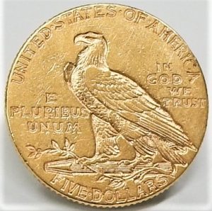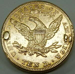 I suspect the coin served duty as a brooch for some time. Although not an incredibly rare coin with over 200000 being struck its too bad this solder contamination can’t easily be removed completely. It’s still a great coin made from 90% pure gold with an actual fine gold weight of 0.48 oz. The gold value could always be obtained by recycling it, but that would be a shame. It’s still just too beautiful to suffer such a fate. The coin is being sold for only for the gold content it contains, no extra fees aside from applicable sales tax. Stock #e10600.