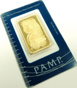 The last Lady Fortuna we had sold in hours and left a few people disappointed they missed out. Here is another one, and this one is in perfect condition. It was only handled to confirm it was genuine. We’ve seen various counterfeit bars is sealed plastic containers that appeared authentic. If you don’t know bullion, know your bullion dealer. This bar is being sold only with the 14 karat gold frame that converts it into a pendant to be worn on a necklace. In the 45 years since PAMP Suisse has been around they have grown from a small supplier of precious metals to jewellers and watch manufactures, to producing private market bullion, and suppling several international governments with currency backed bullion coins. PAMP (Produits Artistiques Métaux Précieux) Suisse bullion is recognized world wide and is among the most sought after. While not quite as common as Royal Canadian Mint products around here, it isn’t rare for us to have some PAMP Suisse bullion in stock. This 1 ounce bar is not only bullion, but it is jewellery once you mount it in the 14 karat yellow gold frame. It only takes a minute to install the bar in the frame with just one screw. Jewellery can certainly be a small part of an investment portfolio when efficiently purchased. This PAMP bar depicts Lady Fortuna on the reverse side on the bar.