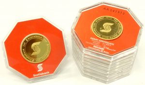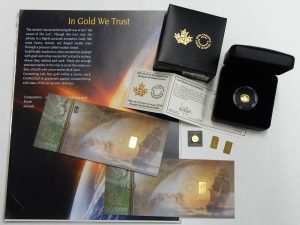 You could buy a good used car for the price of these 9 round gold wafers but we all know what sort of investment a used car is. Ten years ago that car cost $40000.00, today it’s worth $15000.00 (if you’re lucky), ten years from now it’s worth a couple hundred bucks at the scrap yard. Today all 9 wafers will cost you just over $15000.00 CAD. Ten years ago they would have cost about $7200.00. Who knows what they’ll be worth in 10 years, but I imagine they’ll be worth a whole lot more than that rust bucket you thought was pretty cool. Coins don’t rust, they don’t break down, and you don’t have to fill them with fuel every week. You can buy them as a passive investment and sell when the time is right. We offer 1 ounce fine gold coins and bars from time to time but seldom do they show up in lovely untouched presentation boxes. These wafers were manufactured and certified by Valcambi Switzerland and privately labeled for Scotiabank Canada. Valcambi are one of the largest metal refiners and thought to be the largest refiner of gold in the world. Each package is individually serial numbered. The best part about a fine bullion purchase like this is there is no tax. It’s a true investment that is looked upon by the government as a financial transaction and therefore not subject to any form of sales tax. The cost for each wafer changes with the price of gold. You can check the current price of pure gold in Canadian dollars or most other international currencies at Kitco.com. Each coin is priced at current “spot price” plus 2%. We can accept payment in both CAD or USD. We are unable to accept credit card payment for these coins. Everyone should own some gold bullion as a small component of your investments. Buy one, buy 2 or buy them all. First come first serve. Stock number e11108.
