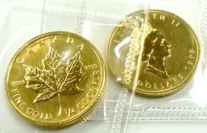 Hurry up. Spot plus only 5% on fractional bullion and NO tax never happens. These smaller gold coins usually trade at the current bullion “spot” price plus at least 10 to 15%. Not only is it a great price, these coins are untouched, still sealed in a protective plastic package. In 1993 and 1995 the Canadian mint produced 158,452 and 127,596 of these little coins. They’re certainly not a rare coin but that doesn’t mean they’re easy to find. We hardly ever have anything other than the full 1 ounce versions for sale. Those who have them usually squirrel them away and are always on the lookout for more. First come first serve on this coin. We only have the 2 so don’t waste time thinking about it. Call us, email us or come in right now! Please add 2% for credit card payment. Stock #e11231 and e11232.
