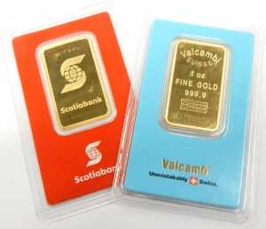 Manufactured and certified by Valcambi Switzerland privately labeled for Scotiabank Canada. Valcambi are one of the largest metal refiners and thought to be the biggest refiner of gold in the world. Individually serial numbered, still sealed in the factory plastic packaging. The best part about a fine bullion purchase like this is there is no sales tax. It’s a true investment that is looked upon by the Canadian government as a financial transaction and therefore not subject to any form of sales tax. The cost changes with the price of gold. You can check the current price of pure gold in Canadian dollars and most other international currencies at Kitco.com. Priced at current “spot price” plus 2%. We can accept payment in both CAD or USD. We are unable to accept credit card payment for these coins. Everyone should own some gold bullion as a small component of your investments. Bullion make a great gift for that difficult person to buy for who has everything. Stock #e12180.