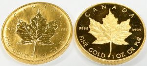 We usually have an ounce or two around here available for purchase. This 1 ounce Canadian Maple Leaf $50.00 (face value) is one of the most popular gold coins in the world, made to a very high 99.99% purity by the Royal Canadian Mint. A gold bullion purchase like this is tax free, no provincial or federal tax is applied to the purchase. The government deems the purchase of bullion as a financial transaction not subject to sales tax. The coin is available for just the value of gold it contains plus 3% ( 5% for credit card purchase). Up to the second gold pricing in most major world currencies can be seen here. Stock #912-00573.