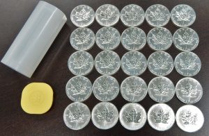 We almost never sell fine silver. We’ve been buying it for years but rarely do we sell it, especially when silver seems so inexpensive at well under $20.00 CAD per ounce. This Royal Canadian mint tube of 25 just came in. They’re all in perfect condition and they’re all 2018s. If you don’t own any silver now’s your chance to get into the bullion market with these. They are being sold for the silver spot price plus just 10% and no HST. The price changes every minute. For an up to the second price in Canadian dollars click here. We are selling this tube and this tube only.