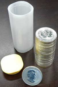 Need a gift for the hard to buy for? I bet they don’t have any of these. We seldom sell fine silver, but sometimes it begins to pile up and we need to free up space. We’ve been buying it for years but rarely do we sell it, especially when silver seems so inexpensive compared to gold. Right now silver is 86 times less expensive than gold. This tube of 25 x 1 ounce 9999 fine silver maple leaf coins are all dated 2106 and are in very good condition.