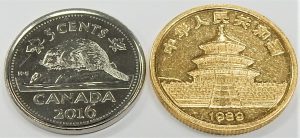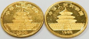 Most “gold coins” are alloyed with other metals making them more durable and long lasting once they get into general circulation. That’s makes sense in principle but when was the last time you saw a gold coin in circulation with regular currency? Truth is, since the advent of paper money, gold coins never go into circulation for face value. With the price of gold around $4,100.00 CAD per ounce, the face value of gold coins can be close to 100 times less than than their gold content. Any gold coin alloyed with other metals making them less than 99.9% pure are subject to sales tax when purchased in Canada. 99.9% pure gold coins like these Chinese pandas are seldom encountered by us. They are usually traded among collectors and purchased as investments. Only a handful of countries produce coins of such purity and these coins never go into general circulation for their face value. Bullion coins like these can legally be purchased in Canada tax free, no sales tax is added to the price. The Canada revenue agency looks upon the sale of fine gold and other precious metals as a financial transaction therefor not subject to sales tax. These 2 coins are being as pair only.