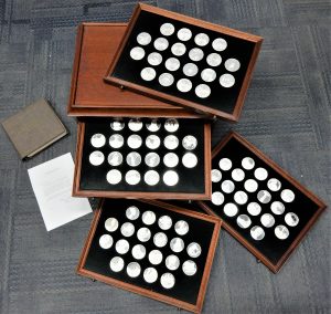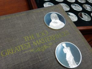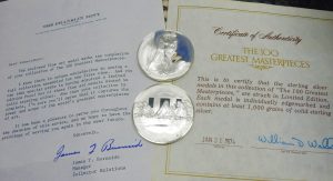 History collectors and those who recognize the value of silver may have an interest in this rare item. The average weight of each medallion is over one troy ounce and is 92.5% fine silver. At today’s silver price (Feb. 4th. 2025) the recyclable silver content alone in this set is over $5,800.00 CAD. The complete collection including the table and book is estate priced at $7,000.00 CAD. Stock #720-00058.