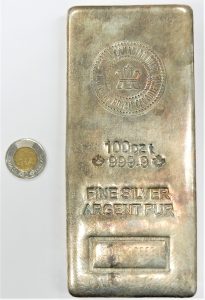It weights just a little under 7 pounds. There is no HST on the sale of precious metals as Revenue Canada looks upon these sales as financial transactions therefore not subject to the HST. Everyone should own some bullion as security against the effects inflation has on your cash. This is the one of the few 100 ounce bar we are selling at the moment. Estate priced at just $2,025.00 CAD (credit card purchases please add 2% service fee). First come first serve. Contact us immediately if you’re interested. Stock e11804.