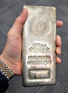 Silver bullion is so cheap right now. 1 ounce of silver is around 77 times less expensive than 1 ounce of gold. The historic relationship of gold vs. silver price is more like 40 to 1 and gold is only around 17 times more rare than silver. There have only been a few times in history that I’m aware of when the gold/silver ratio has been higher. This tells us that gold is overpriced or that silver is underpriced. With all the chaos in the world my personal opinion is both silver and gold are under valued but much more so in the case of silver. With silver pricing as low as it has been for the last few years we’ve slowly been acquiring silver but seldom (almost never) do we sell any of it. For all those people who call us asking for silver bullion here’s your chance. These two 100 ounce bars of 999 fine silver were made by The Royal Canadian Mint. The bars measure just 18.4cm x 8.1cm x 2.1cm but are surprisingly hefty when you hold them in you hand.