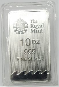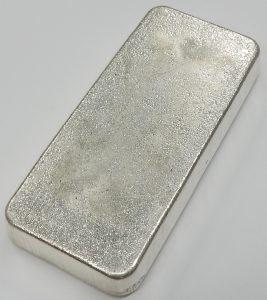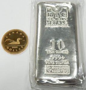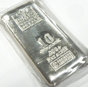 Silver has shown some positive movement lately but you can still make a compelling case for the great value it still offers. 1 ounce of silver is 86 times less expensive than 1 ounce of gold. Over the last 100 years or so the historic relationship of gold vs. silver price is more like 40 to 1, yet gold is only around 17 times more rare than silver. There have only been a few times in history that I’m aware of when the gold/silver ratio has been higher than right now. This tells us that gold is overpriced or that silver is underpriced. With all the chaos in the world my personal opinion is both silver and gold are under valued but much more so in the case of silver. With silver pricing as low as it has been for the last few years we’ve slowly been acquiring silver but seldom (almost never) do we sell any of it. For all those people who call us asking for silver bullion here’s your chance to pick up a bit. This 10 ounce bar of 999+ fine silver was made by Republic Metals Corp. 8.4cm x 4.0cm x 1.0cm, but is surprisingly hefty when you hold it in your hand. At over 2/3 of a pound it is quite substantial despite the small size.