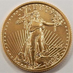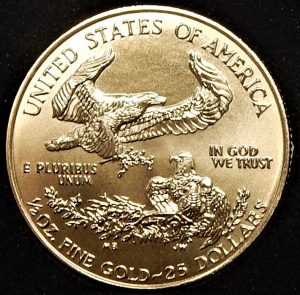 These coins are far more rare than the Canadian Maple Leaf gold bullion coin that came out in 1979. Introduced in 2006, the U.S. mint release an average of less than 200,000 examples per year. Our latest estate bullion coin is dated 2013 and is in excellent condition showing little evidence of rough handling. There is no sales tax on the sale of precious metals including this coin. Revenue Canada looks upon fine gold and other bullion sales as financial transactions therefore not subject to any form of sales tax Everyone should own some bullion as security against the effects inflation has on your cash. This is a 99.99% pure gold coin and is very soft, so handle with care. If you happen to drop it on a hard surface it WILL dent. The price of this coin changes everyday with the price of gold. We are pricing it at the “spot” price of gold plus 4%. You can check the current price of gold anytime at Kitco. We can accept payment in both US and Canadian dollars. Credit card purchases are subject to a 2% service fee. Stock #e12239.