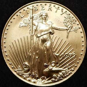 We’ve said it before and we’ll say it again. “Everyone should own some gold”. Not just because it’s beautiful to look at but it feels great between your fingers and it could be a great investment too. Investing in the stock market is a key element to many investment portfolios, but one could also argue holding a little gold is important. After all, even the oldest companies can’t compete with the 5000 year history that gold has as an object of considerable value. Although the value of gold is always changing against what it is typically compared to (paper currency). It has always been welcomed for trade in almost all cultures for any other commodity you may need. You can’t just print more gold. It’s a good way to offset the affects of a weakening dollar and inflation. We don’t see many US coins around here and are happy to offer this 1999 22 karat US $50.00 coin that contains exactly 1 troy ounce of the precious metal. A beautiful likeness of Lady Liberty shows on the obverse side with powerful images of the majestic bald eagle on the reverse.