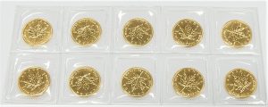 You could buy a good used car for the price of these 10 gold coins but we all know what sort of investment a used car is. Ten years ago that car cost $40000.00, today it’s worth $16000.00 (if you’re lucky), ten years from now it’s worth a couple hundred bucks at the scrap yard. Today all 10 coins will cost you less than $16000.00 CAD. Ten years ago they would have cost about $7000.00. Who knows what they’ll be worth in 10 years, but I imagine they’ll be worth a whole lot more than that rust bucket you thought was pretty cool. Coins don’t rust, they don’t break down, and you don’t have to fill them with fuel every week. You can buy them as a passive investment and sell when the time is right. We have 1 ounce fine gold Canadian maple leaf coins from time to time but seldom do they show up in a tube of 10 from the Royal Canadian Mint. The best part about a fine bullion purchase like this is there is no tax. It’s a true investment that is looked upon by the government as a financial transaction not subject to any form of sales tax. The cost for each coin changes with the price of gold. You can check the current price of pure gold in Canadian dollars or most other international currencies at Kitco.com. Each coin is priced at current “spot price” plus 4%. We can accept payment in both CAD or USD. We are unable to accept credit card payment for these coins. Everyone should own some gold bullion as a small component of your investments. Buy one, buy 2 or buy them all. First come first serve. Stock #e10177-e10186.
