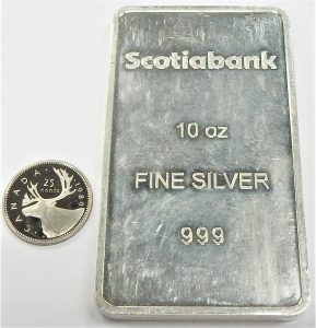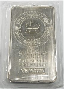We usually squirrel away this sort of thing away but at the moment it is taking up some value space. Who knows the next time we’ll sell off some of our silver hoard (don’t hold your breath). There is no HST on the sale of precious metals as Revenue Canada looks upon these sales as financial transactions therefore not subject to the HST. Everyone should own some bullion as security against the effects inflation has on your cash. The premiums are high at the moment for all precious metals as supply is quite scarce. This bar is offered at spot plus 10% (credit card purchases please add a 2% service fee). Stock #912-00182.