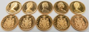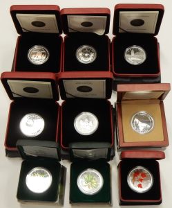 Sold as a set only please. Whoever is the first to contact us can purchase them. The current price of the nine coins including the 15% premium is approximately $340.00 CAD. Stock numbers 912-00578, 79, 80, 81, 82, 83, 84, 85, 86.