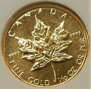 Fraction pure gold non taxable coins rarely come up for sale. We get a good number of the full 1 oz. variety but 1/10 oz. examples are uncommon. This 2102 9999 purity Canadian maple leaf is perfect in every way. It’s never been out of its plastic container. Not a scuff, scratch or fingerprint can be seen. Most major coin dealers are asking around $250.00 for one of these if you’re lucky enough to even find one.