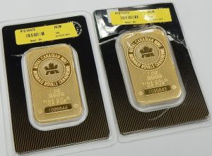 Being able to buy recognized gold bullion at “spot” price plus just 1% is unheard of. Buying this sort of gold bullion is considered a financial transaction and not subject to any form of sales tax. This price is for NON credit card payment only. A 2% service fee will be added for Visa or MasterCard payment. Interac e-Transfer and wire payment accepted for our out of town clients. First come first serve. We are limiting this sale to just these 5 bars. For an up to the minute gold quote just click here and add just 1% to calculate your price per ounce. We gladly accept payment in USD or CAD. Stock numbers e12446, e12447, e12448, e12449, e12450.