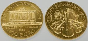 While not too common around here Austrian Philharmonic 1 ounce gold coins are among the most popular bullion products produced. They are one of the world’s best selling gold coins purchased by collectors and gold investors alike. They have been around since 1989 when they debuted with a face value of 2,000 Austrian shillings. In 2002 the face value changed to €100 euros to reflect the adoption of the Eurozone currency.