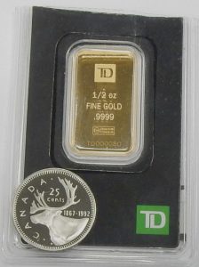 Not only is there added risk when buying heavier gold bars, but your pool of potential customers is waaaaaaaaay smaller when that 10 bar is worth around $28,000.00 CAD. Yes please, we’ll take all the smaller fractional gold bullion you have. Our latest gold bullion offering is this 1/2 ounce TD bar with a nice low serial number of 000080. We cut into the original sealed packaging to confirm this one is legit. There are plenty of cheap fakes out there in sealed packaging. If the person selling you gold won’t cut the seal for you to confirm the contents, walk away. This bar is currently available through the TD bank where it sells for as low as 8.7% over the spot price and can be seen online here. You need to be a TD customer for this preferred price and payment must be made from your TD account. We are offering this excellent condition bar for spot plus 5% for NON credit card purchase. Please add 2% for credit card payment. There is no additional sales tax on fine bullion. Get it while you can, fractional gold bullion doesn’t show up around here every day. Stock #912-00526.