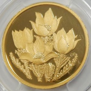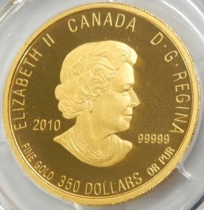 The Royal Canadian mint is arguably the finest in the world. Investors and collectors trust RCM for exceptional quality and worldwide acceptance when both buying and selling. RCM were the first mint to manufacture a coin of 99.9% purity in 1979. They raised the bar in 1983 to 99.99%. Occasionally they produce special series with an incredible “5 nines” 99.999% purity. Coins of this quality rarely show up in our estate department and usually sell for a significant premiums on the market. Five 9s coins are far more rare and used mostly for low mintage and commemorative editions. This are rare coin, just 1400 Prairie Crocus examples were minted in 2010. You’re not likely to encounter another one of these again. As with all forms of bullion, this coin can be purchased exempt of sales tax. The Canada Revenue Agency looks upon the sale of bullion like this as a financial transaction therefor not subject to sales tax. This coin is legal Canadian tender and has the unusual a face value of $350.00. It is interesting to note the coins weight of exactly 35 grams works out to $10.00 per gram.