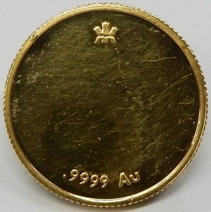 Leave it the the Canadian mint to do it again. In 1979 the world’s first 99.9% pure gold coin was produced by them. In 1982 they improved the purity to 99.99%, also a first for the world. Once again in 1998 they raised the bar with an unheard of purity level of 99.999% for special commemorative issues. We are fortunate at Bill Le Boeuf Jewellers to see the 999 and 9999 quite regularly but this “5 nines” example is a first for us. Checking out the Royal Canadian Mint website shows this coin was limited to a production of only 400. Since 2014 the mint hasn’t released regular 9999 coin production numbers but considering previous years there could be close to one million of those in circulation. Considering its rarity this coin is an absolute bargain priced at only the current value of gold plus 5% and NO SALES TAX. We accept payment in both U.S. and Canadian dollars. For current pricing of gold in CAD click here. First come first serve, we only have this one of these super rare 99999 gold coins in stock and we’ve never had another. For credit card payment please add 2%. Stock #e12517.