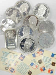 This mixed lot of .999 fine silver bullion is definitely MLB baseball biased, but there is also an NHL hockey medallion, a Royal Canadian Mint 2016 maple leaf $5.00 coin, and a U.S. Sunshine mint bar. Whether you’re a Major League Baseball fan or not, this is a great collection of silver bullion at a price that can’t be beat. If you’ve read this far you know that silver is finally starting to move, but still trails the advances gold has had over the past couple of decades. Silver is 81 times less expensive than gold right now, but many feel this gap will shrink as people look for the higher potential appreciation possible with silver. The 8 round medallions are in perfect sealed condition in protective plastic containers. There are 5 certificates that describe the mintage numbers with a copyright date of 1991. This lot is offered at only 5% over their silver content value. Fine bullion like this is not subject to sales tax. Sold as a 10 ounce collection only. First come first served. If you want them please email to info@BillLeBoeufJewellers.com or give us a call 705 728 3343. We don’t expect these to last. For credit card purchases please add 2%. Stock #912-00648.