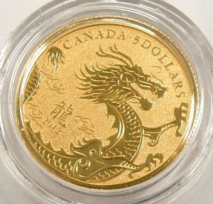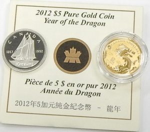 2012 Year of the Dragon commemorative 99.99% pure gold coin. The Canadian coin has a face value of just $5.00, but it currently contains around $385.00 in pure gold. It was minted in a larger run of 38,888 examples. It remains in untouched condition still in its protective plastic container. Noticeably smaller than a Canadian dime but 50% heavier.