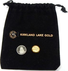 It comes in a Kirkland Lake Gold black drawstring pouch. Being gold bullion of 99.99% purity, it is not subject to any form of sales tax. We are offering it for sale for only 5% over the gold content. For the current spot price of gold in U.S. or Canadian dollars click on Bullionvault.com. Stock #912-00644.