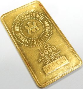 Our latest estate bullion offering is this Royal Canadian Mint 1 ounce pure gold bar. It is 99.99% pure, this type of purity is amount the finest that is commercially available. Occasionally the Royal Canadian Mint produce some coins that are 99.999% pure. Gold bullion is exempt from sales tax in Canada. The price fluctuates every day relative to the dollar. A great source for the current gold spot price is BullionVault.com. We are offering this 1 ounce bar for only 2% over the spot price. Owning a little gold can be considered insurance to protect you against the effects of inflation on your cash. We are not big dealers of precious metals although it comes and goes with regularity. If you’d like a little gold bullion this is a great one to start with, RCM products are among the most sought after and trusted in the world. For VISA/MasterCard purchases please add an additional 2% to cover credit card fees. Stock #912-00669.