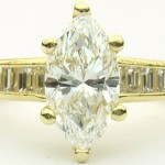 This diamond came in with an Amsterdam diamond report declaring the diamond “loupe clean of river colour”. These old terms refer to flawless clarity with perfect colour. Hoping for a similar opinion from the Gemological Institute of America the diamond was sent to New York for a more internationally accepted opinion. The results came back with a VVS1 clarity with an E colour. Both characteristics are just 1 grade off perfect. Fewer than 4% of diamonds receive a quality grade like this or better. The added length of a fancy shaped marquise makes them look bigger than an ordinary round diamond. The actual dimensions of 10.32mm x 5.62mm x 3.73 make for an impressive display. GIA report #2165031879 describes the symmetry and polish as very good. The diamond also will exhibit strong blue fluorescence when exposed to long-wave ultra violet light. The Estate price is $15,500.00, CAD. Stock #e8067.