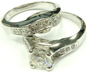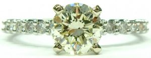 Like pretty much everything in this world, diamonds are priced in United States dollars then converted to your local currency when you purchase them. When Bill Le Boeuf Jewellers purchases new diamonds from New York, India, Israel etc. the vendors don’t want to be paid in Canadian dollars, Indian rupee or the Israel shekel. Diamond dealers only accept United States Dollars. That’s all fine as long as you have USD to pay for them. If you don’t, the U.S. cash is going to cost you a few percent due to bank currency exchange rates. The great thing about our estate diamonds is they are usually from Canada, we buy them with Canadian dollars and sell them in Canadian dollars. It may not sound too important but saving a few percent on a diamond purchase makes a noticeable difference. At one point or another all retailers lose a couple percent buying U.S. dollars then lose a couple more selling Canadian dollars in order to buy more USD so they can buy more diamonds from foreign suppliers. It’s a vicious circle that our estate inventory is thankfully not part of, making us extra competitive (let’s just keep it our little secret). This 1.24 carat diamond was traded in from a recently married young couple who inherited it. At this point in their lives a big diamond really wasn’t what they needed. We were happy to help them out and they were happy to pay off some debt. We submitted the pretty diamond to GIA in New York for certification. Almost every important diamond in the world comes with a Gemological Institute of America report. If the diamond you’re considering doesn’t come with a GIA report be extra careful and ask why not? The May 2016 report came back as expected with very good results of 1.24 carats, VS1 clarity, J colour and a very good cut. The full GIA document can be see online here. That’s the beauty of an estate diamond; they are usually bigger, usually better and ALWAYS less expensive. This diamond sets the benchmark in value at just $6600.00 CAD. This diamond is currently set in a Canadian made 10.5 gram, 14 karat white gold engagement/wedding ring set containing 0.20 carats of additional small diamonds. The two rings are available for $1200.00 extra. Stock #e10672.
