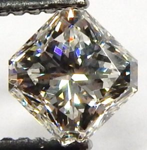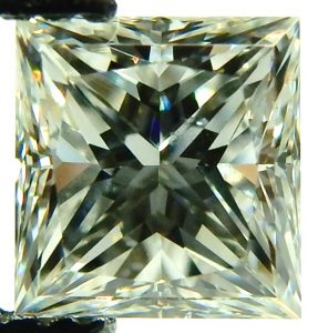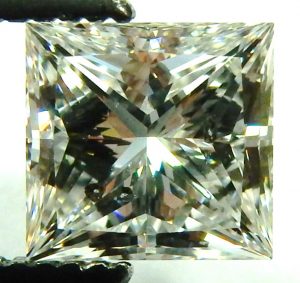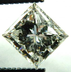 Be extremely careful buying fancy-shaped diamonds. There are no universally accepted standards for cut, geometry, and proportions for fancy shapes. Thankfully this diamond is nicely cut. The table facet of 74% is a little larger than optimum, but it is still good, all the other proportions are quite nice. The girdle edge is a pleasant medium to thick, many poorly manufactured princess cut diamonds have very thick to extremely thick girdles that add nothing but extra weight. Far too many princess cut diamonds are cut waaaaaay too deep. This example has a depth of 72.7% which is appropriate for a square/rectangular princess cut. The overall dimensions of 5.88mm x 5.32mm are much larger than many 1.00 carat princess cuts.